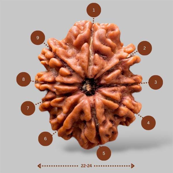 Originating from Nepal, this Rudraksha is a small-sized bead (20 mm to 24 mm), naturally found in different shades of brown. Every bead is unique in its appearance but carries the same powerful vibrations of spiritual energy. It is widely believed that wearing a 9 Mukhi Rudraksha helps in reducing anxiety, calming the mind, and boosting focus, making it ideal for people dealing with stress, confusion, or overthinking.